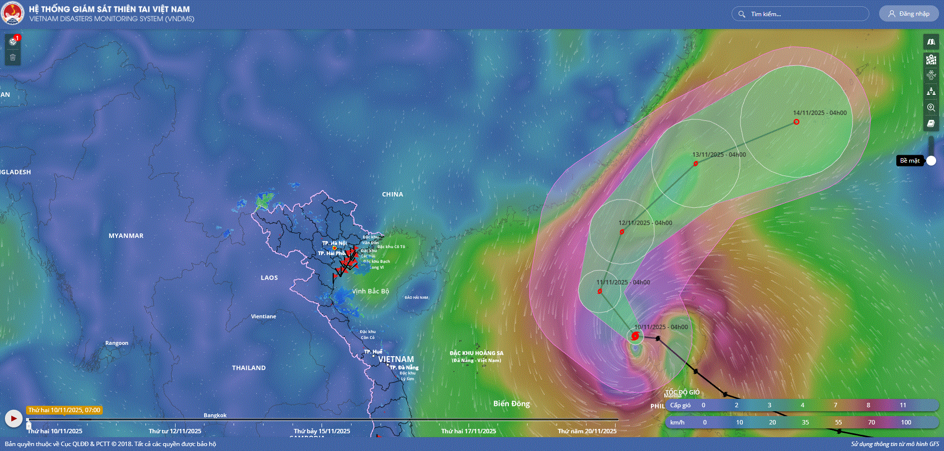 - Hồi 01 giờ ngày 10/11, vị trí tâm bão ở vào khoảng 17,2 độ Vĩ Bắc; 120,3 độ Kinh Đông, trên vùng ven biển phía Tây đảo Lu-dông (Philippin). Sức gió mạnh nhất vùng gần tâm bão mạnh cấp 14 (150-166km/giờ), giật cấp 17. Di chuyển theo hướng Tây Bắc, tốc độ khoảng 25km/h