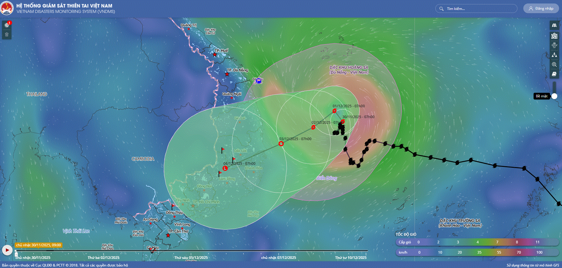 - Hồi 19 giờ ngày 30/11, vị trí tâm bão ở vào khoảng 14,3 độ Vĩ Bắc; 112,2 độ Kinh Đông, trên vùng biển phía Tây Bắc khu vực Giữa Biển Đông. Sức gió mạnh nhất vùng gần tâm bão mạnh cấp 9 (75-88km/h), giật cấp 11. Hầu như ít dịch chuyển.