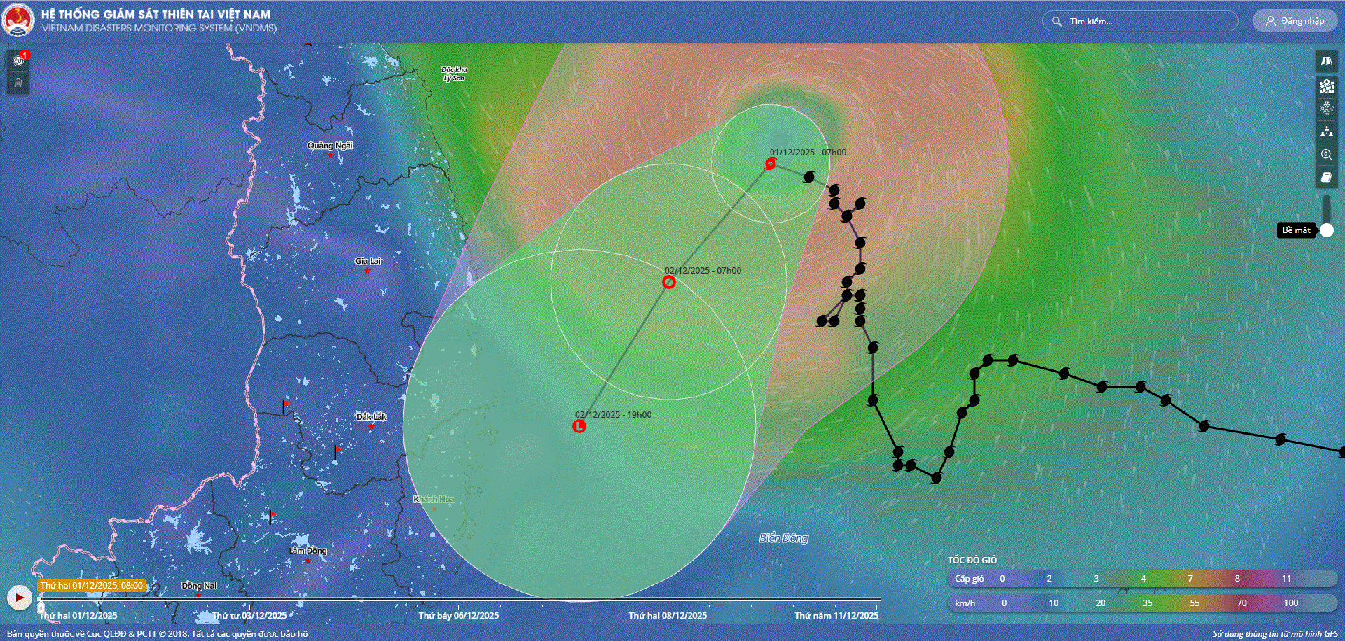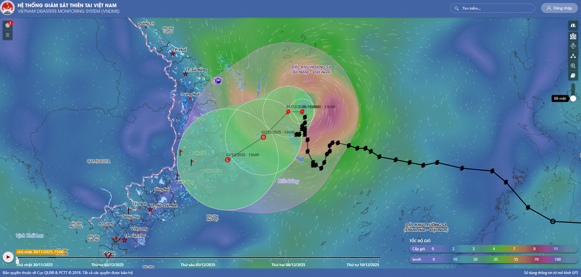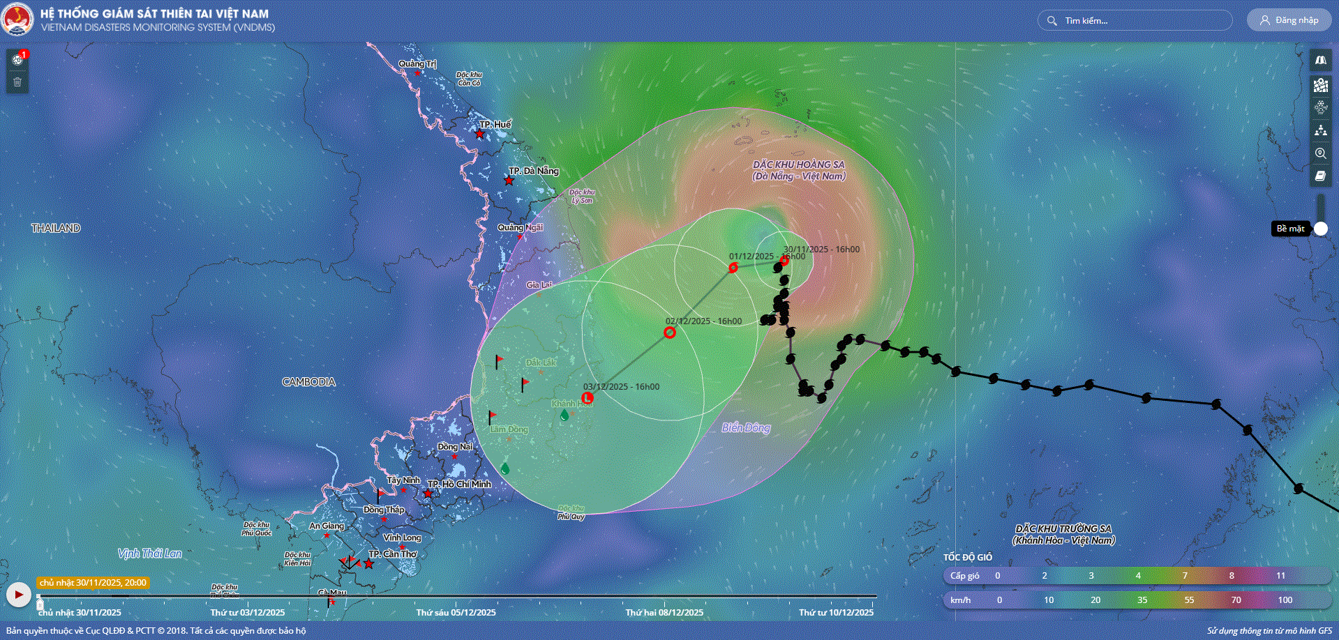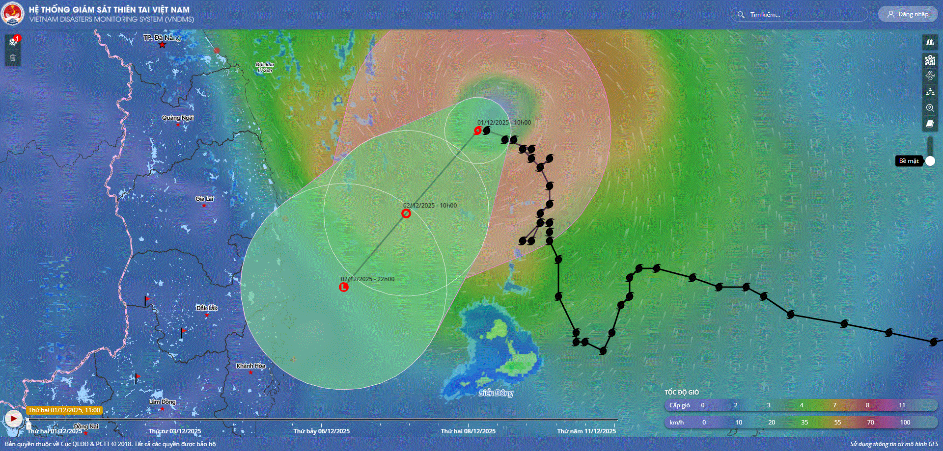 - Hồi 10 giờ ngày 01/12, vị trí tâm bão ở vào khoảng 14,7 độ Vĩ Bắc; 111,5 độ Kinh Đông, trên vùng biển phía Tây Bắc khu vực Giữa Biển Đông. Sức gió mạnh nhất vùng gần tâm bão mạnh cấp 8 (62-74km/h), giật cấp 10. Hầu như ít di chuyển.