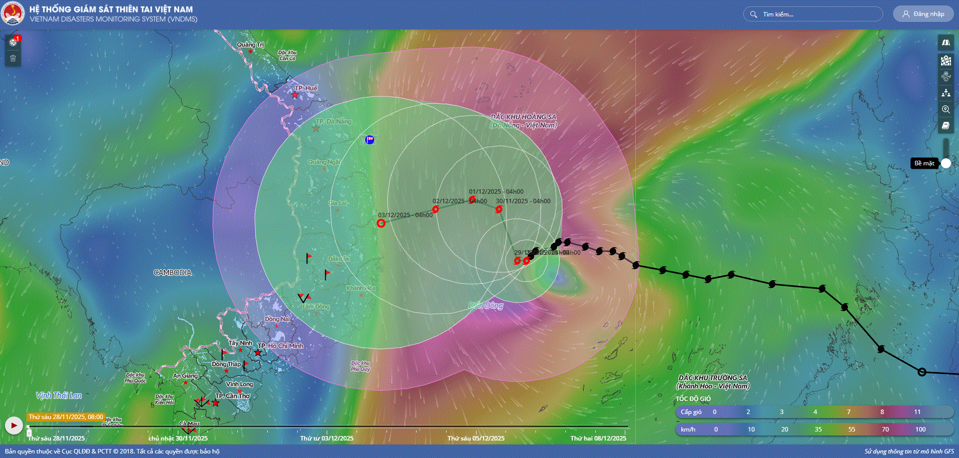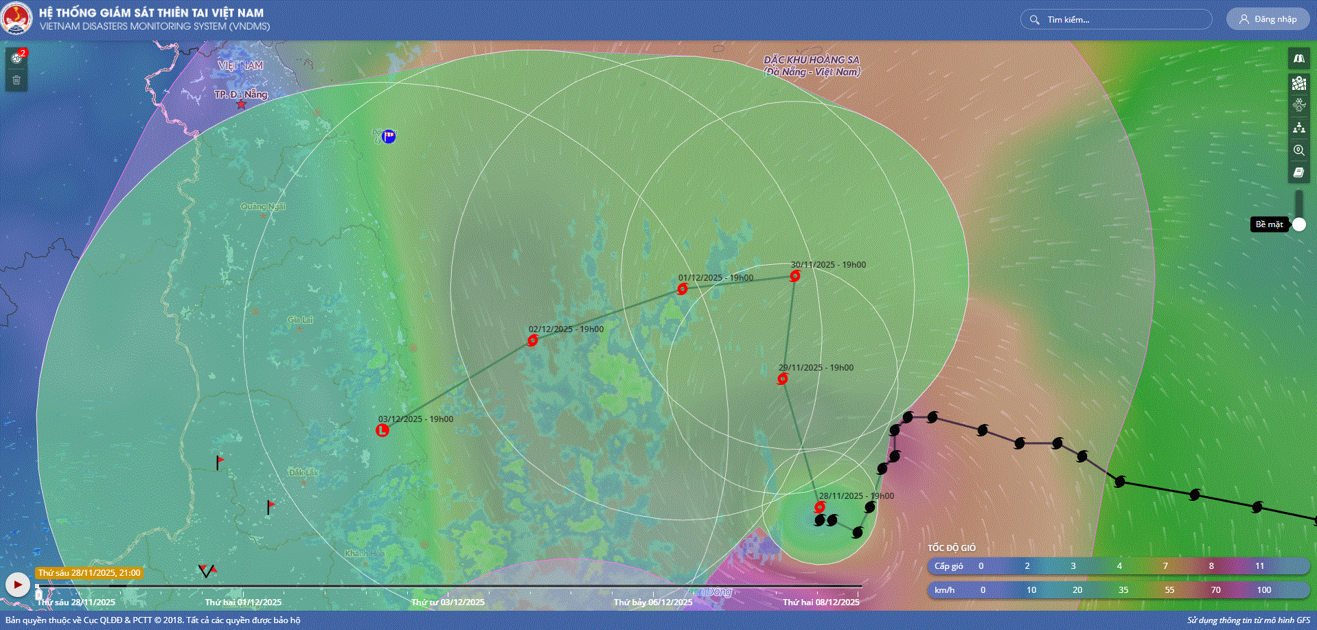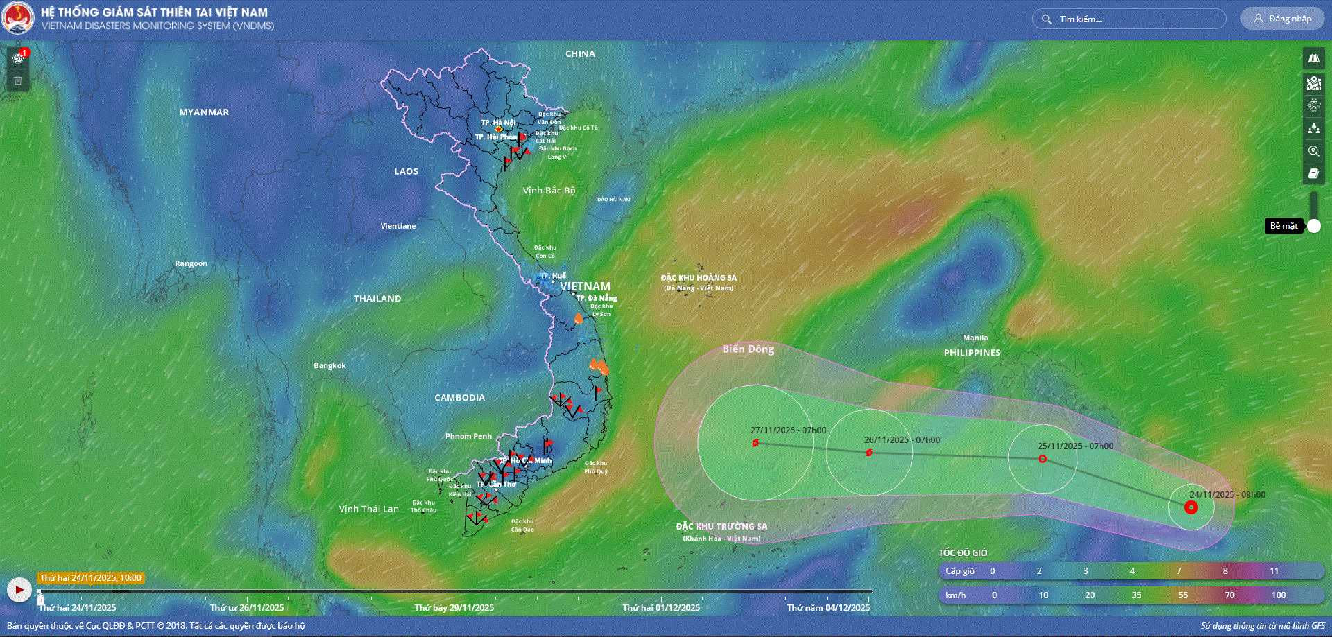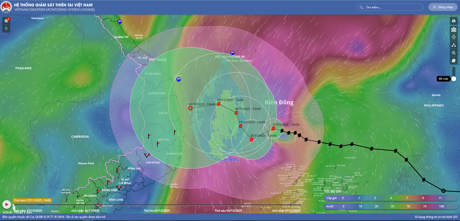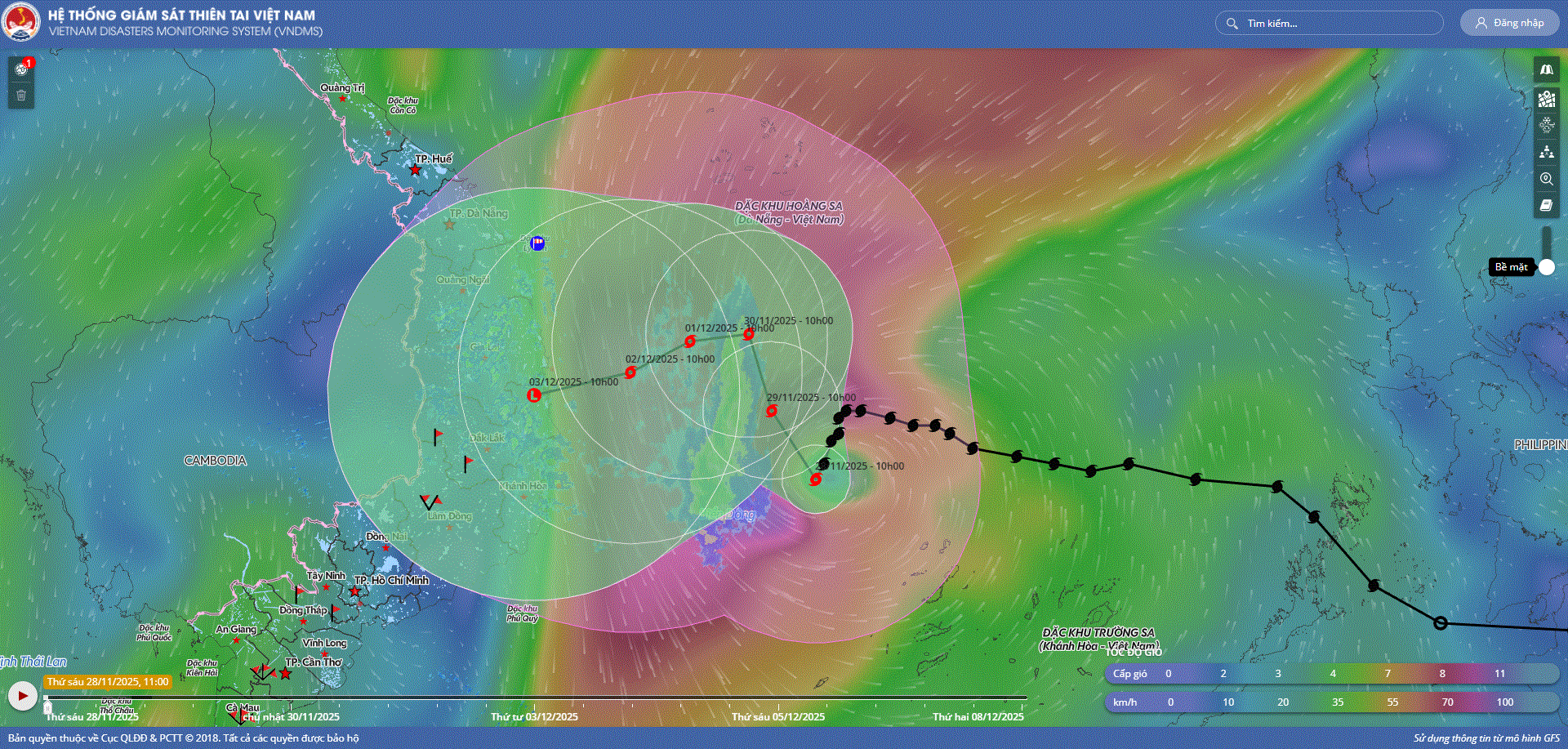 - Hồi 10 giờ ngày 01/12, vị trí tâm bão ở vào khoảng 14,7 độ Vĩ Bắc; 111,5 độ Kinh Đông, trên vùng biển phía Tây Bắc khu vực Giữa Biển Đông. Sức gió mạnh nhất vùng gần tâm bão mạnh cấp 8 (62-74km/h), giật cấp 10. Hầu như ít di chuyển.