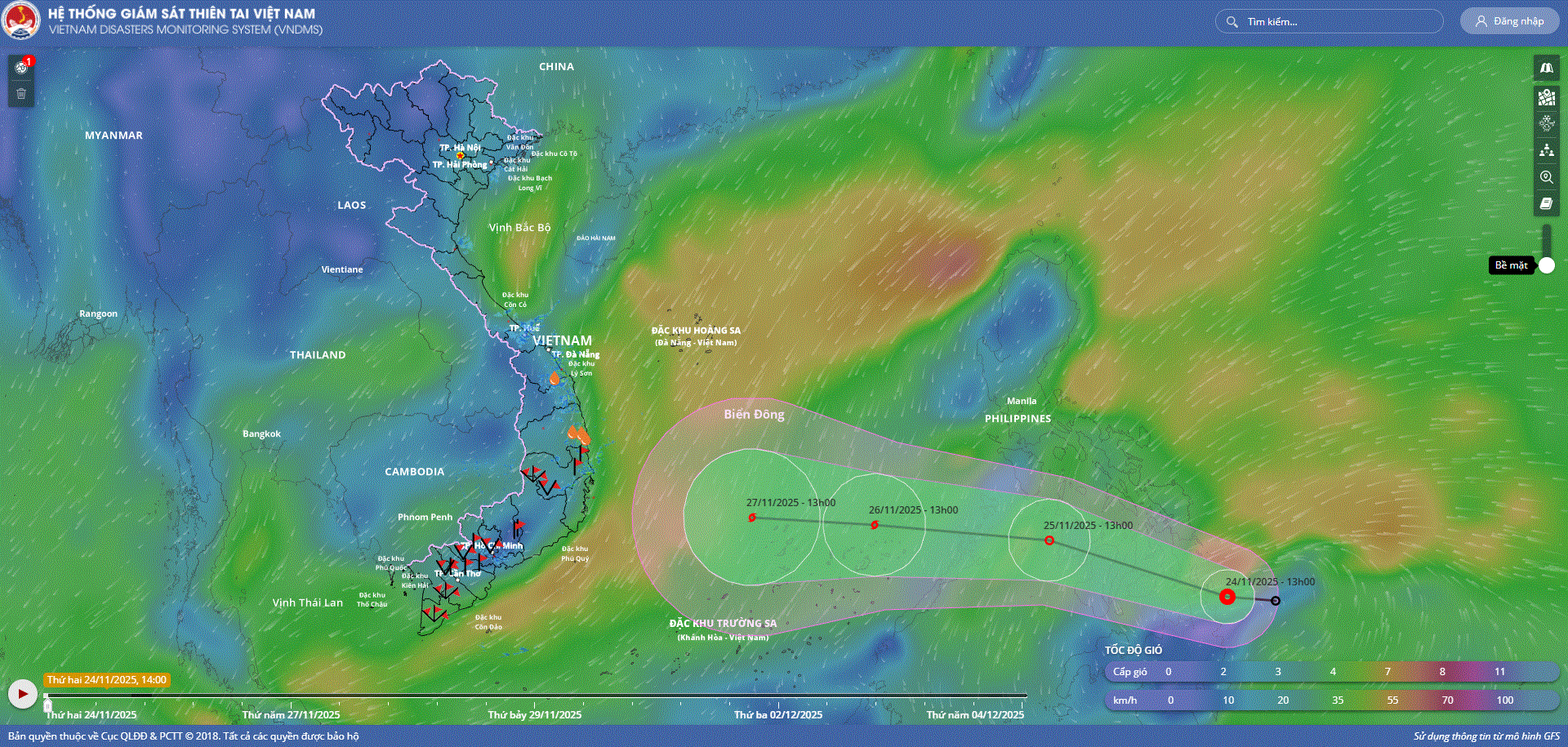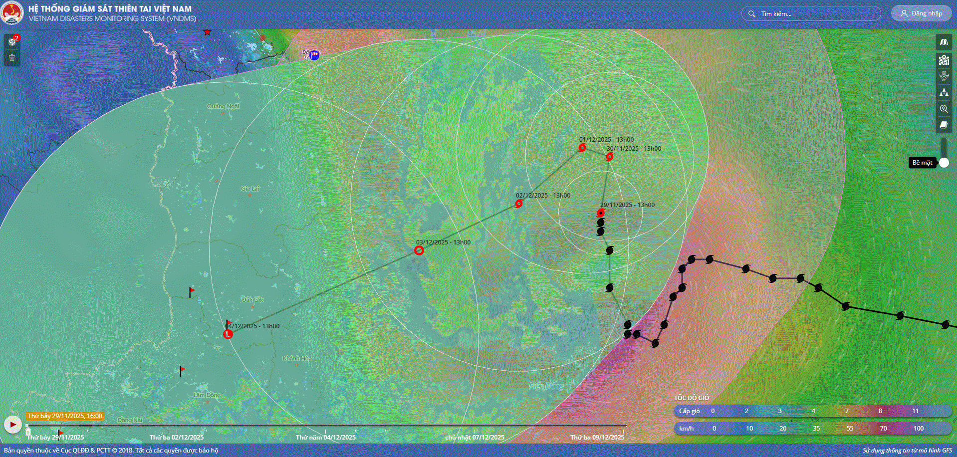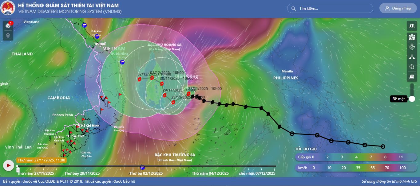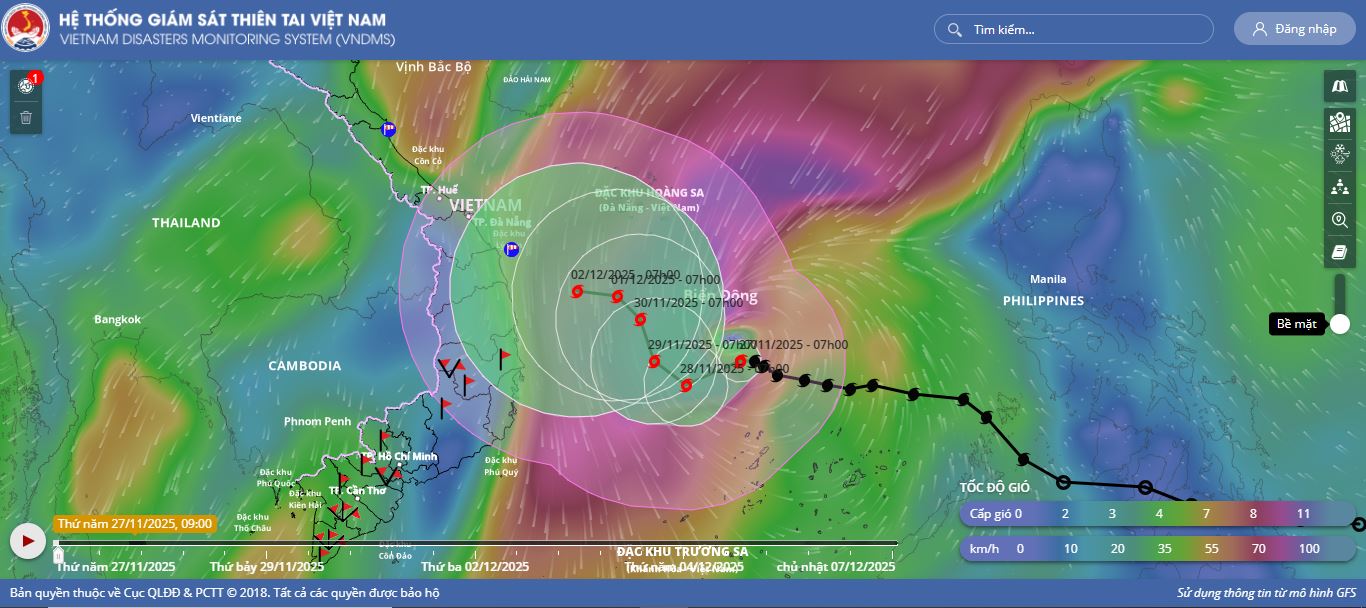 - Hồi 19 giờ ngày 29/11, vị trí tâm bão ở vào khoảng 13,5 độ Vĩ Bắc; 112,0 độ Kinh Đông, trên vùng biển phía Tây Bắc khu vực Giữa Biển Đông. Sức gió mạnh nhất vùng gần tâm bão mạnh cấp 9 (75-88km/h), giật cấp 11. Bão hầu như ít dịch chuyển.