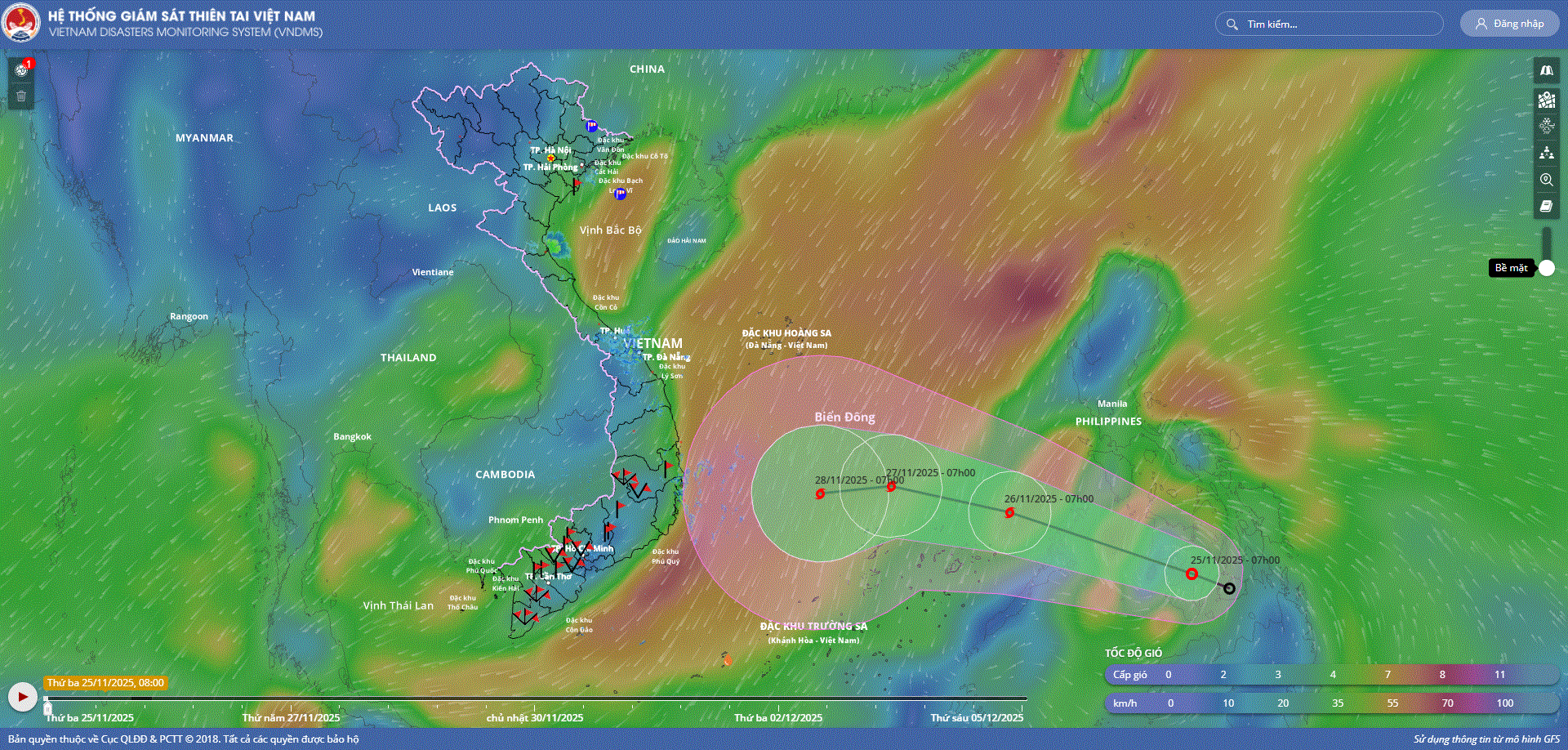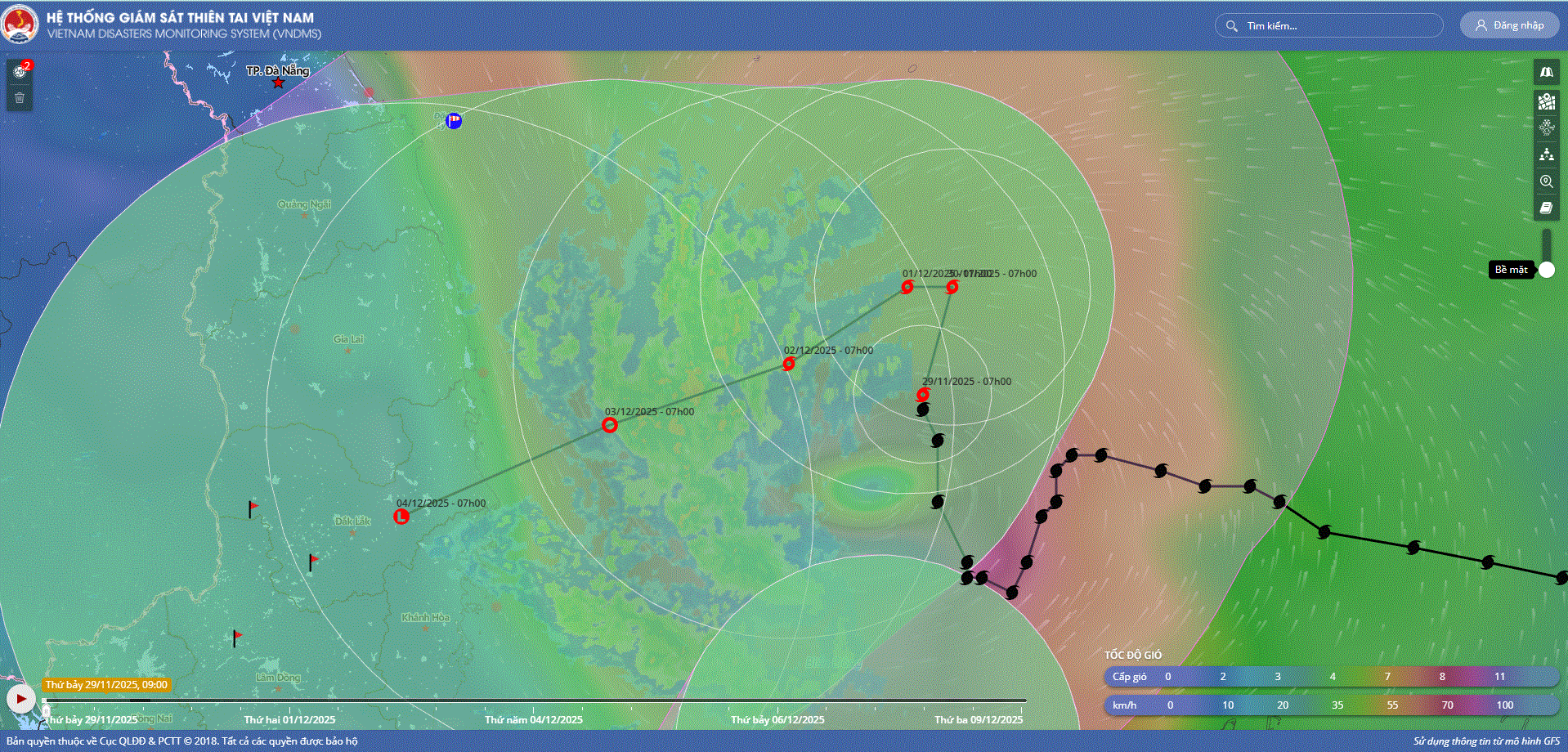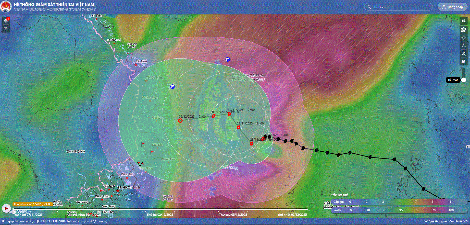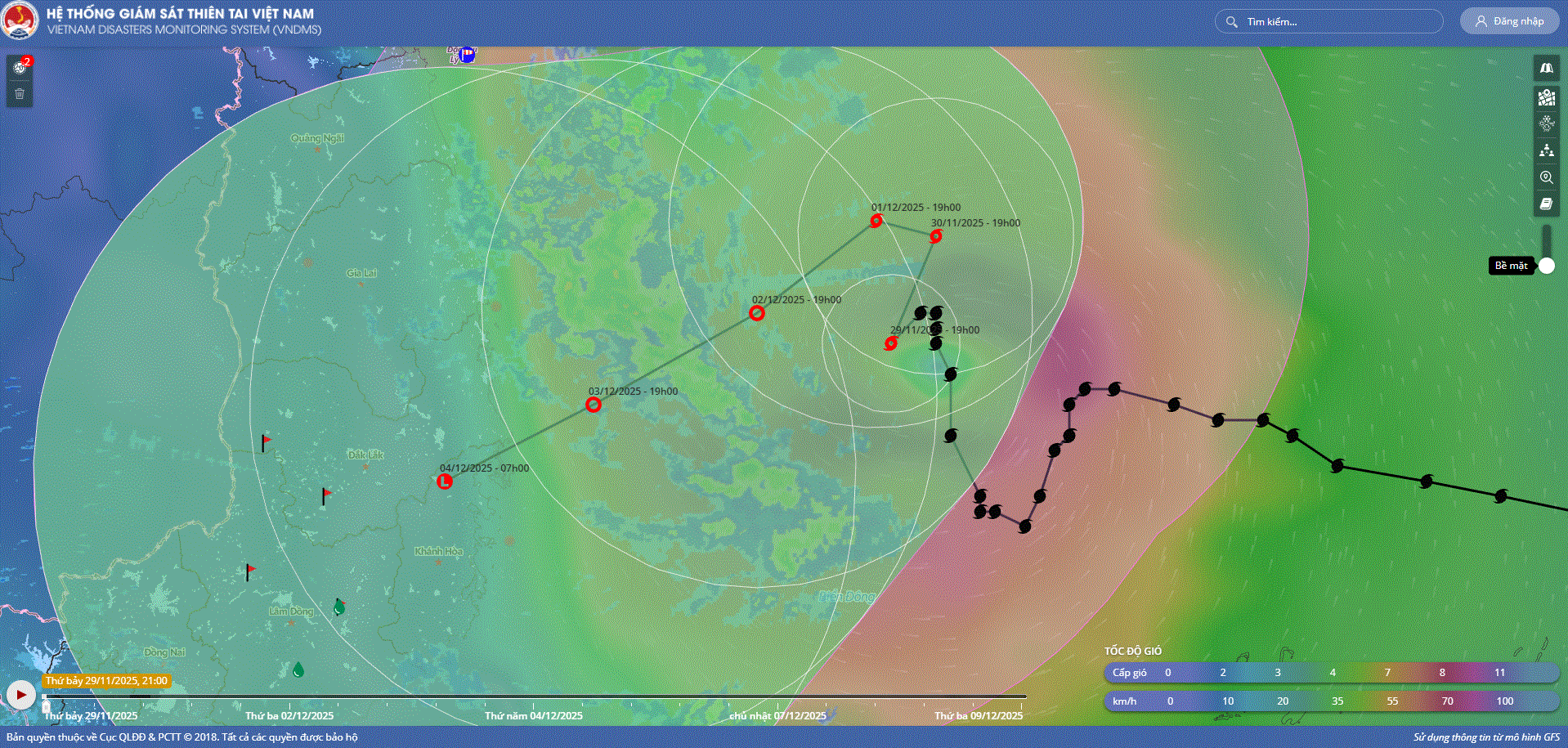 - Hồi 19 giờ ngày 29/11, vị trí tâm bão ở vào khoảng 13,5 độ Vĩ Bắc; 112,0 độ Kinh Đông, trên vùng biển phía Tây Bắc khu vực Giữa Biển Đông. Sức gió mạnh nhất vùng gần tâm bão mạnh cấp 9 (75-88km/h), giật cấp 11. Bão hầu như ít dịch chuyển.