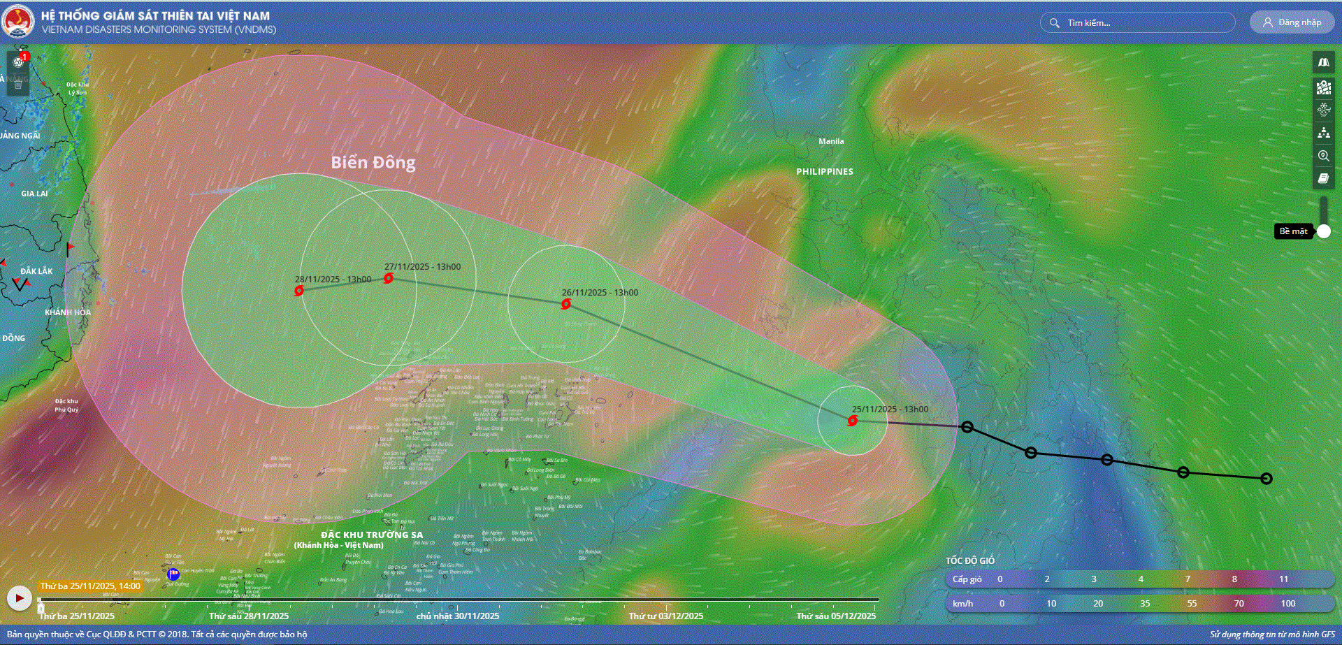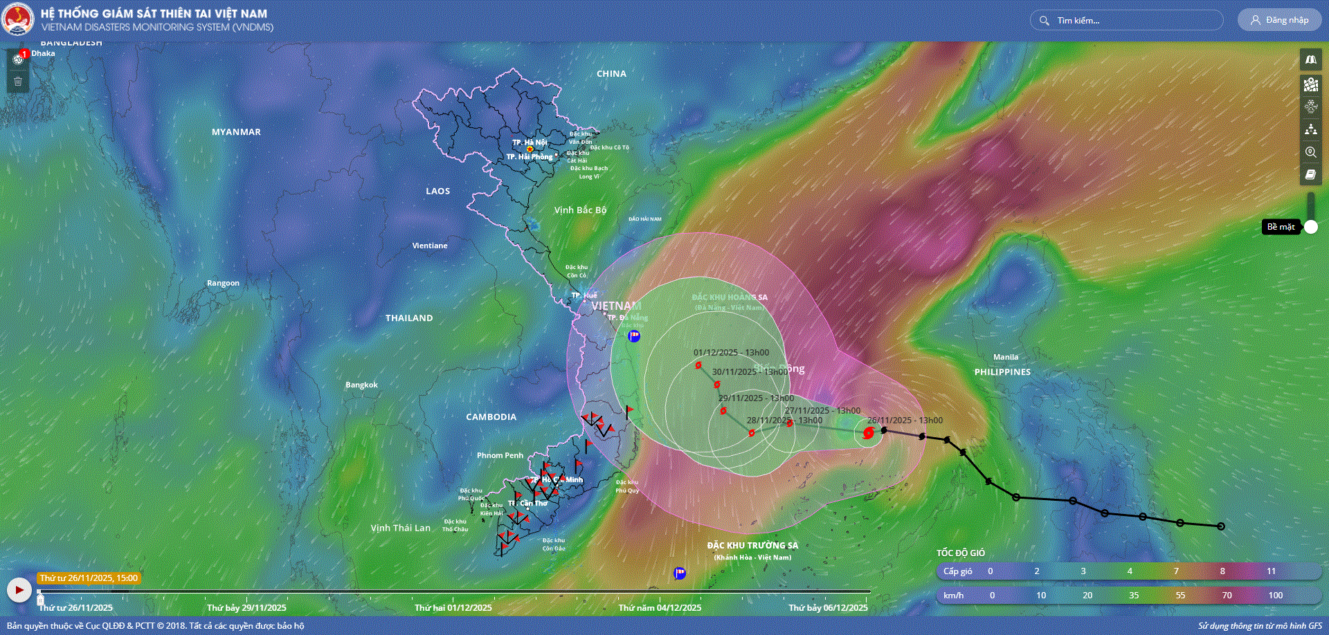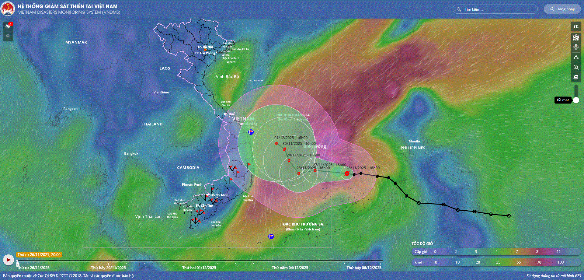 - Hồi 16 giờ ngày 26/11, vị trí tâm bão ở vào khoảng 12,5 độ Vĩ Bắc; 116,1 độ Kinh Đông, cách đảo Song Tử Tây khoảng 230km về phía Đông Bắc. Sức gió mạnh nhất vùng gần tâm bão mạnh cấp 10 (89-102km/h), giật cấp 13. Di chuyển theo hướng Tây Tây Bắc với tốc độ khoảng 20km/h.