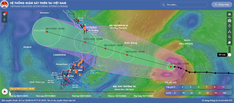 Hồi 16 giờ ngày 04/11, vị trí tâm bão ở vào khoảng 10,7 độ Vĩ Bắc; 121,3 độ Kinh Đông, trên vùng biển phía Tây khu vực miền Trung Phi-líp-pin, cách đảo Song Tử Tây khoảng 770km về phía Đông. Sức gió mạnh nhất vùng gần tâm bão mạnh cấp 13 (134-149 km/giờ), giật cấp 16. Di chuyển theo hướng Tây với tốc độ khoảng 25km/h.