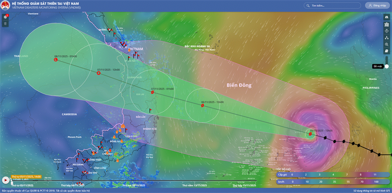 Hồi 16 giờ ngày 04/11, vị trí tâm bão ở vào khoảng 10,7 độ Vĩ Bắc; 121,3 độ Kinh Đông, trên vùng biển phía Tây khu vực miền Trung Phi-líp-pin, cách đảo Song Tử Tây khoảng 770km về phía Đông. Sức gió mạnh nhất vùng gần tâm bão mạnh cấp 13 (134-149 km/giờ), giật cấp 16. Di chuyển theo hướng Tây với tốc độ khoảng 25km/h.