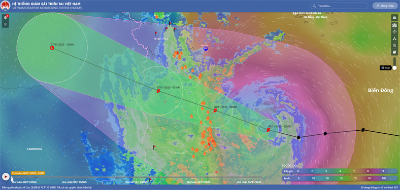 Hồi 19 giờ ngày 05/11, vị trí tâm bão ở vào khoảng 12,3 độ Vĩ Bắc; 116,3 độ Kinh Đông, cách đảo Song Tử Tây khoảng 240km về phía Đông Đông Bắc, cách Quy Nhơn (Gia Lai) khoảng 800km về phía Đông Đông Nam. Sức gió mạnh nhất vùng gần tâm bão mạnh cấp 14 (150-166 km/giờ), giật cấp 17. Di chuyển theo hướng Tây Tây Bắc, tốc độ khoảng 25km/h.