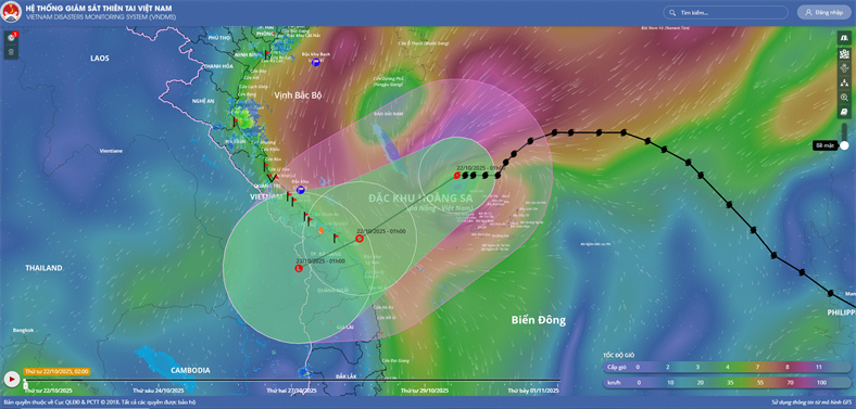 Hồi 22 giờ ngày 21/10, vị trí tâm bão ở vào khoảng 17,5 độ Vĩ Bắc; 111,4 độ Kinh Đông, trên vùng biển phía Tây Bắc đặc khu Hoàng Sa, cách Tp.Đà Nẵng khoảng 370km về phía Đông Đông Bắc. Sức gió mạnh nhất vùng gần tâm bão mạnh cấp 9-10 (75-102km/giờ), giật cấp 12. Di chuyển theo hướng Tây Tây Nam, tốc độ 10-15km/h