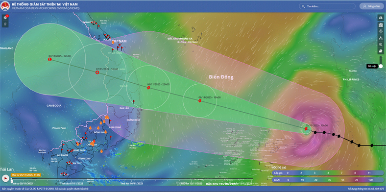 Hồi 16 giờ ngày 04/11, vị trí tâm bão ở vào khoảng 10,7 độ Vĩ Bắc; 121,3 độ Kinh Đông, trên vùng biển phía Tây khu vực miền Trung Phi-líp-pin, cách đảo Song Tử Tây khoảng 770km về phía Đông. Sức gió mạnh nhất vùng gần tâm bão mạnh cấp 13 (134-149 km/giờ), giật cấp 16. Di chuyển theo hướng Tây với tốc độ khoảng 25km/h.