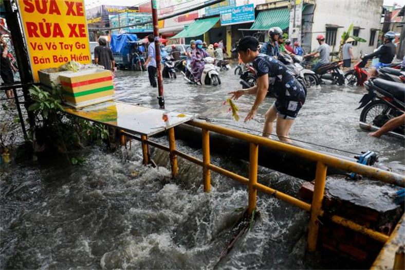 Sau mưa lớn, nước cuồn cuộn trên đường phố Sài Gòn
