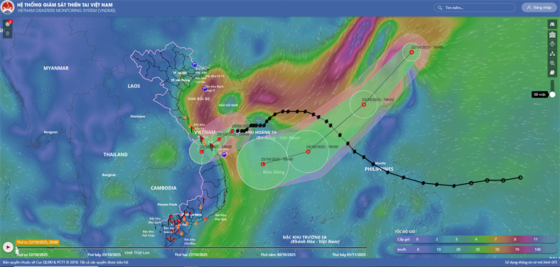 Hồi 07 giờ ngày 22/10, vị trí tâm bão ở vào khoảng 17,1 độ Vĩ Bắc; 110,7 độ Kinh Đông, trên vùng biển phía Tây Bắc đặc khu Hoàng Sa, cách Tp.Đà Nẵng khoảng 280km về phía Đông Đông Bắc. Sức gió mạnh nhất vùng gần tâm bão mạnh cấp 10 (89-102km/giờ), giật cấp 12. Di chuyển theo hướng Tây Tây Nam, tốc độ khoảng 10km/h.