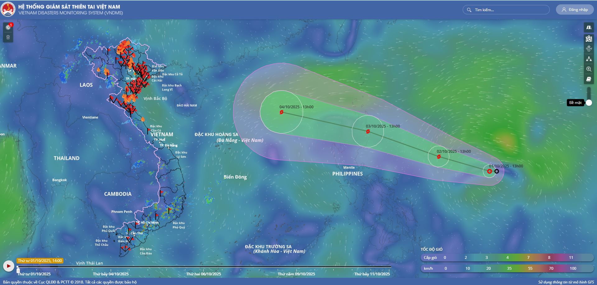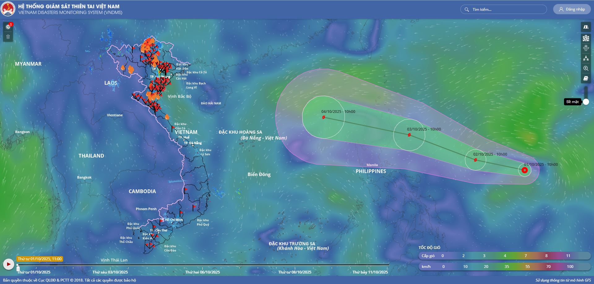 - Hồi 10 giờ ngày 04/10, vị trí tâm bão ở vào khoảng 18,2 độ Vĩ Bắc; 116,0 độ Kinh Đông, trên khu vực Bắc Biển Đông, cách đảo Hải Nam (Trung Quốc) khoảng 570km về phía Đông Đông Nam. Sức gió mạnh nhất vùng gần tâm bão mạnh cấp 11 (103-117km/giờ), giật cấp 14. Di chuyển theo hướng Tây Tây Bắc, tốc độ khoảng 25km/h.