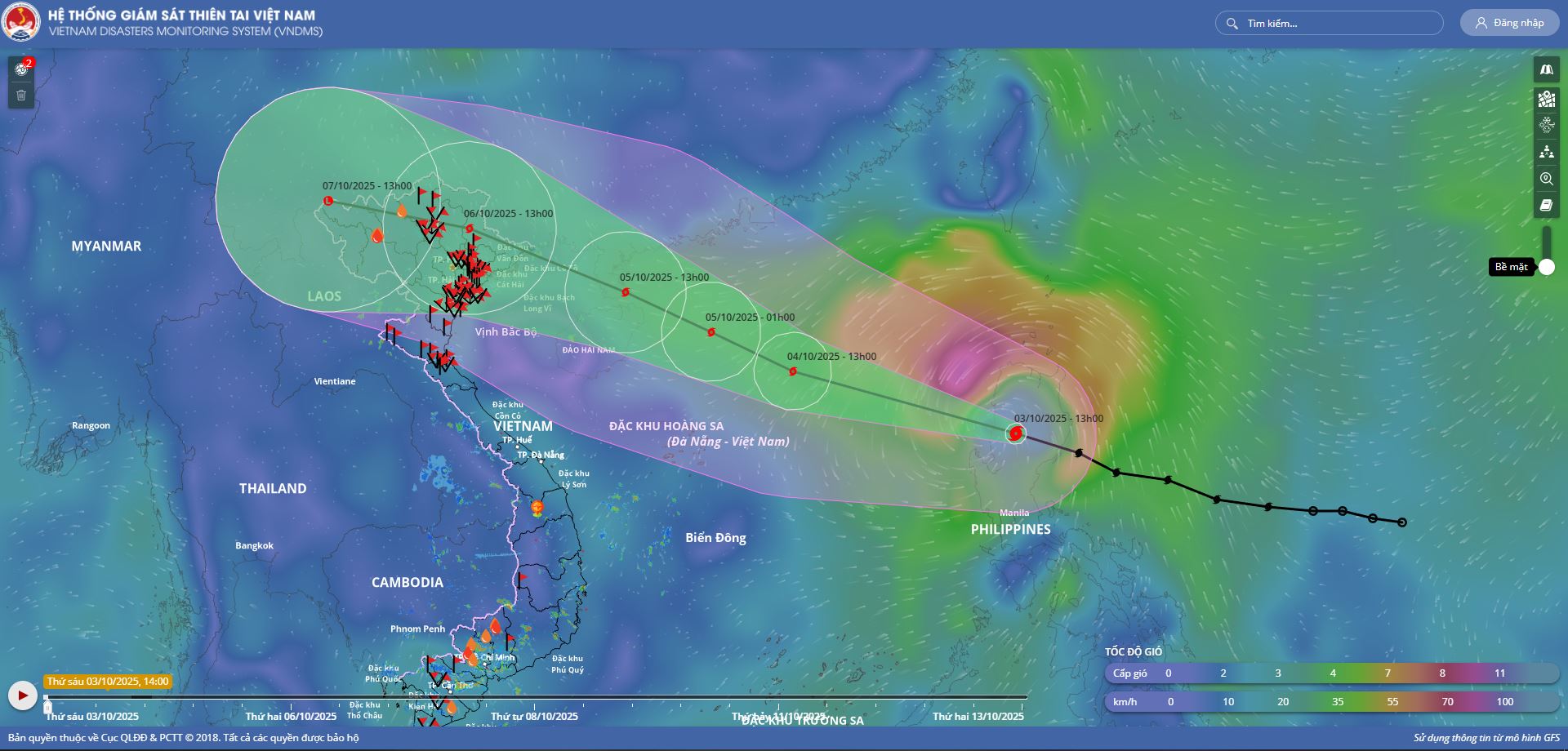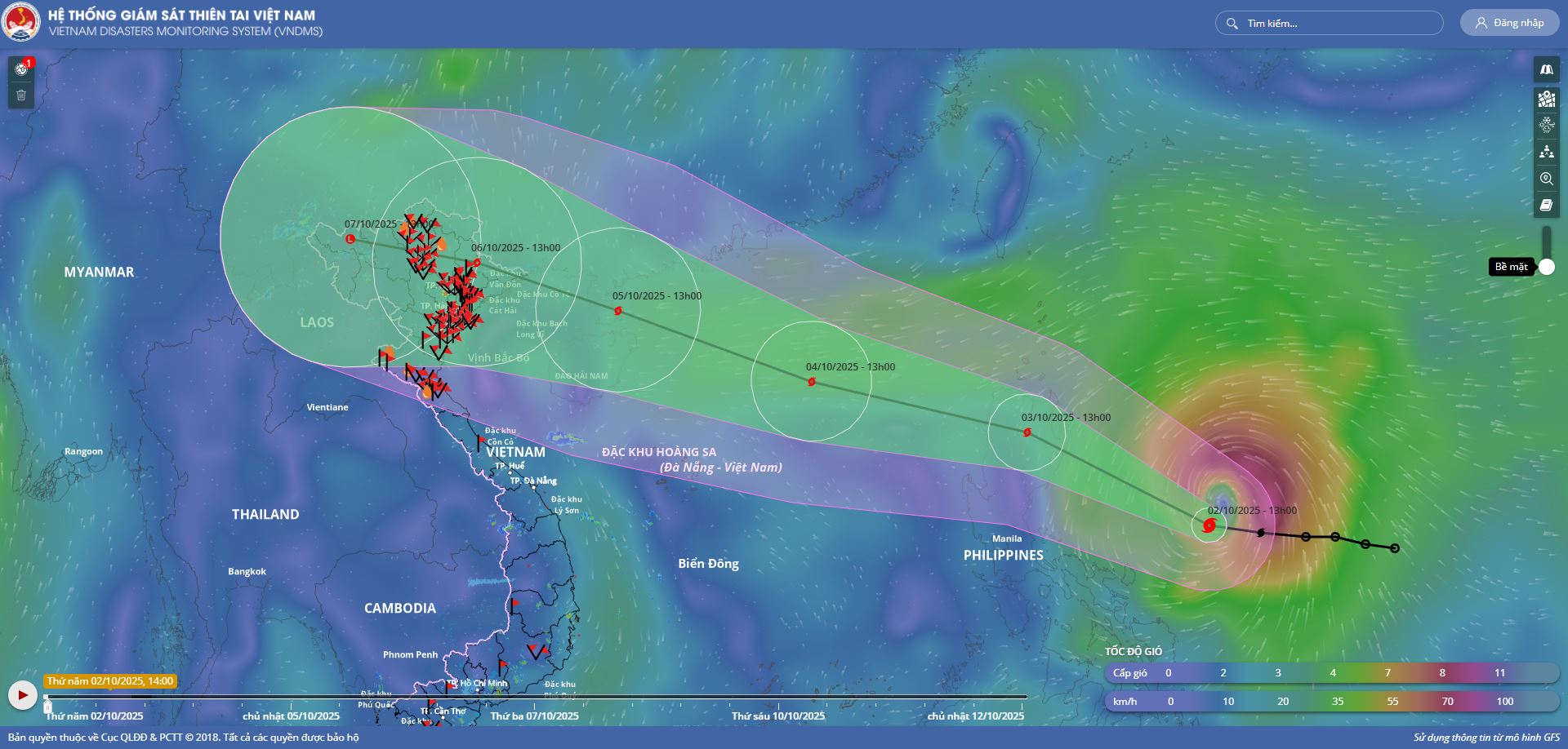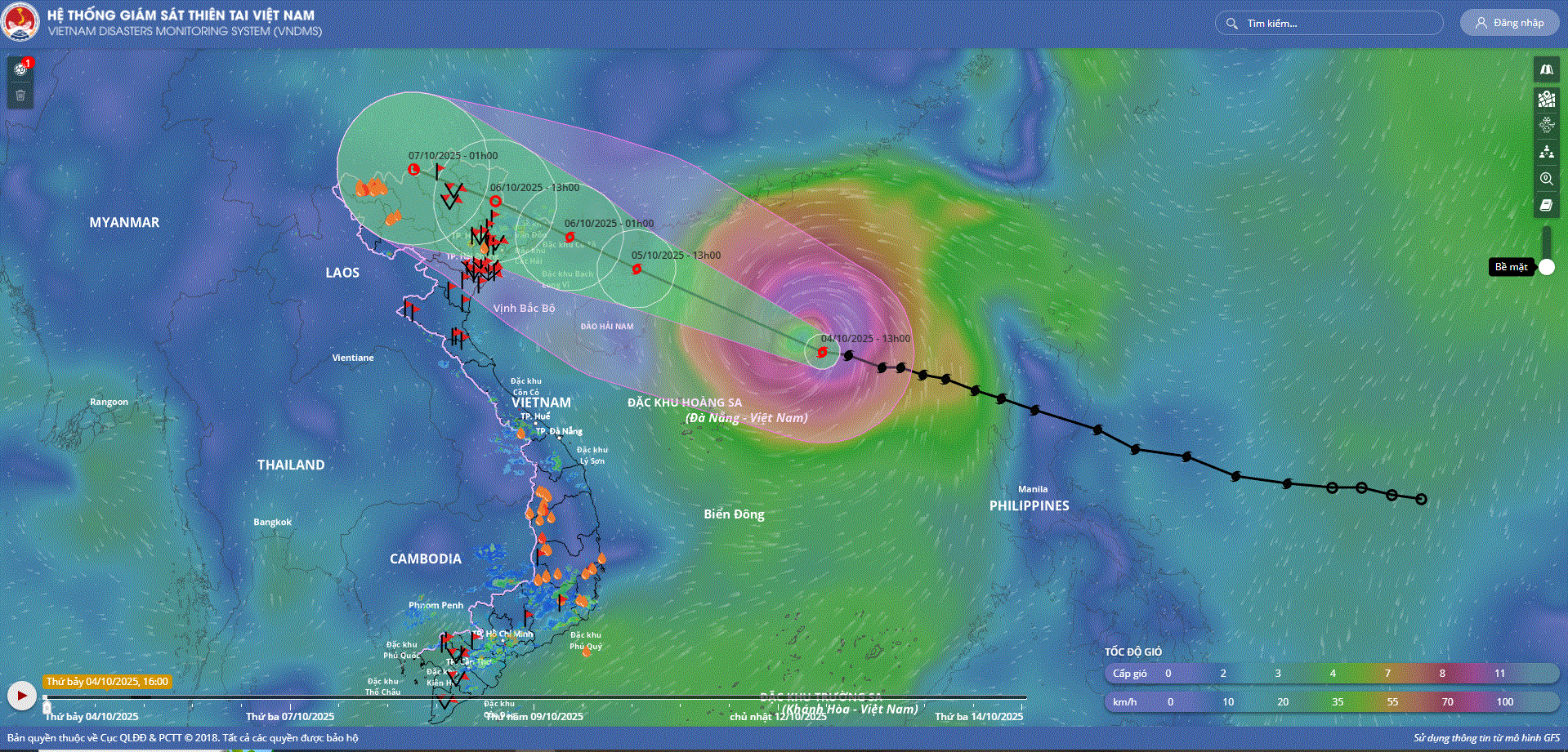 - Hồi 19 giờ ngày 04/10, vị trí tâm bão ở vào khoảng 18,7 độ Vĩ Bắc; 114,3 độ Kinh Đông, trên khu vực Bắc Biển Đông, cách đảo Hải Nam (Trung Quốc) khoảng 380km về phía Đông Đông Nam. Sức gió mạnh nhất vùng gần tâm bão mạnh cấp 12 (118-133km/giờ), giật cấp 15. Di chuyển theo hướng Tây Tây Bắc, tốc độ khoảng 25km/h.