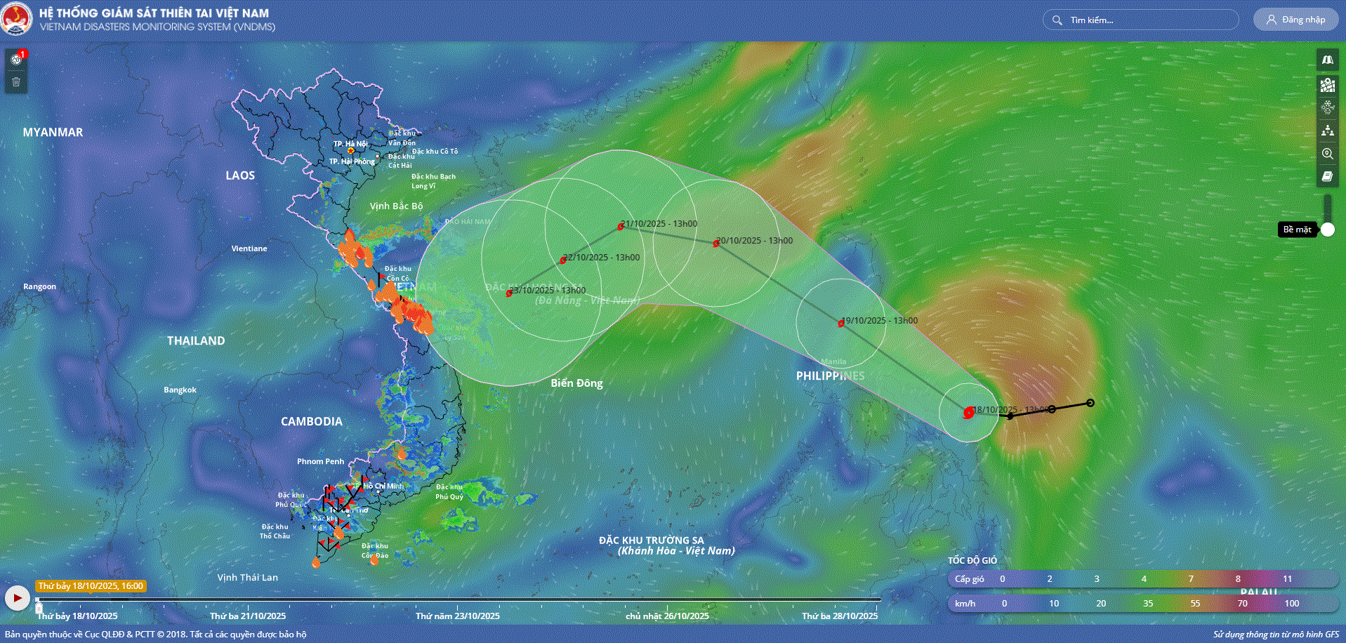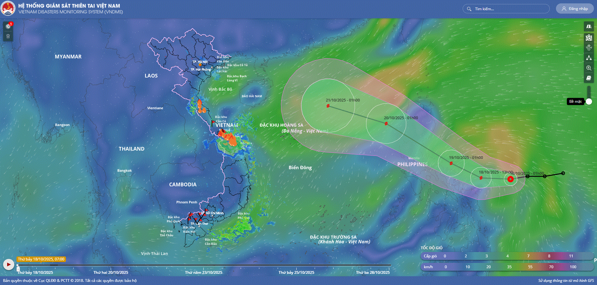 - Hồi 19 giờ ngày 18/10, vị trí tâm bão ở vào khoảng 13,3 độ Vĩ Bắc; 124,2 độ Kinh Đông, trên khu vực phía Đông miền Trung Phi-líp-pin. Sức gió mạnh nhất vùng gần tâm bão mạnh cấp 8 (62-74km/giờ), giật cấp 10. Di chuyển theo hướng Tây Tây Bắc với tốc độ khoảng 20km/h.
