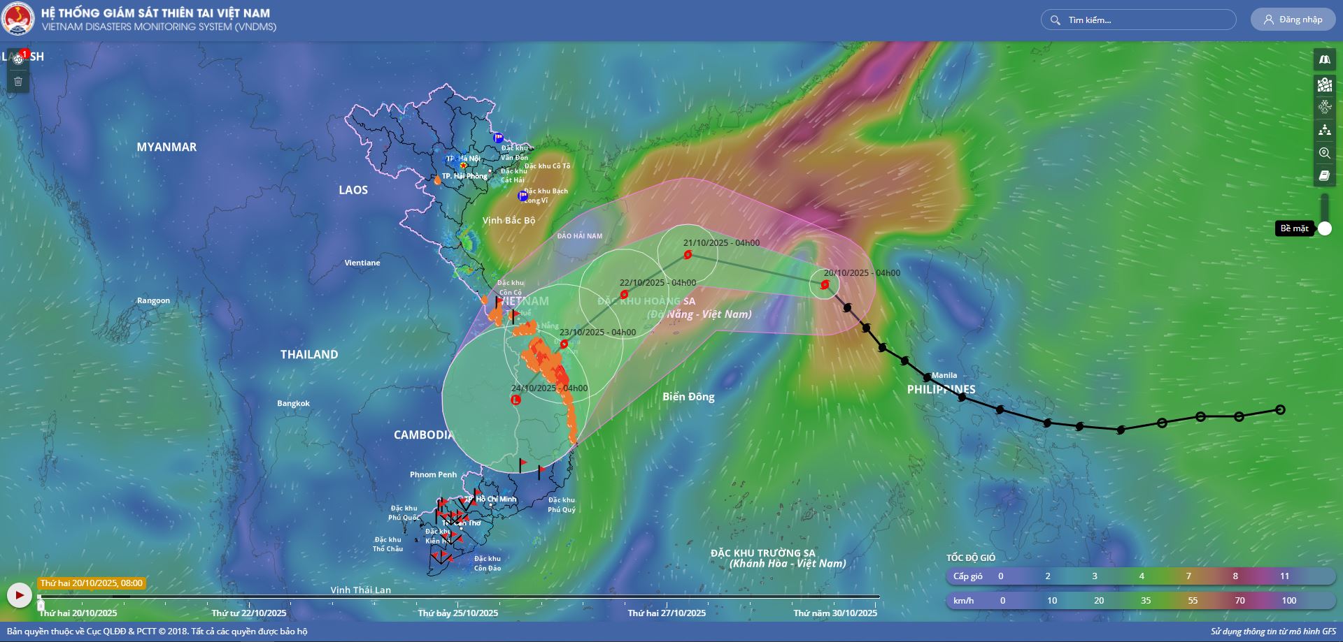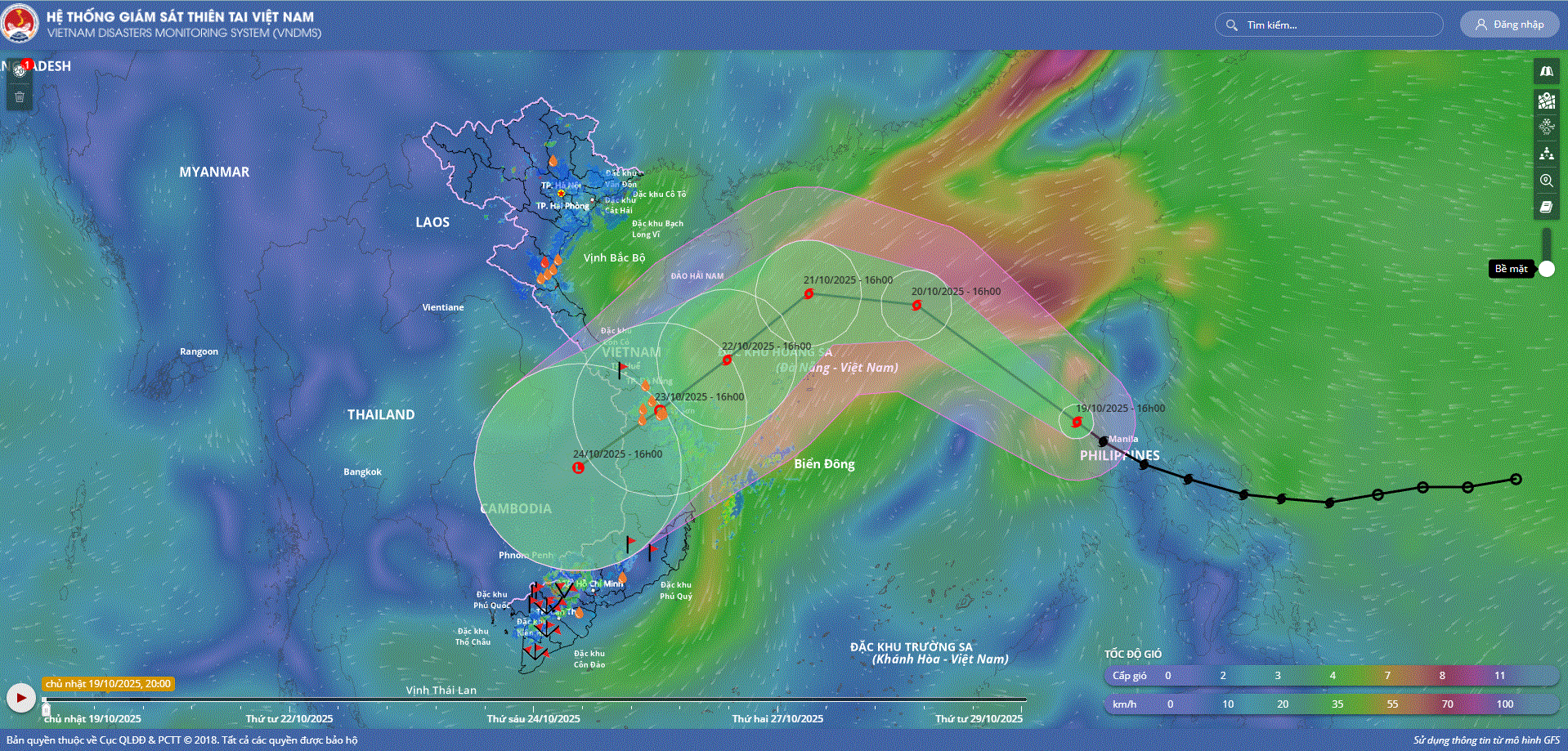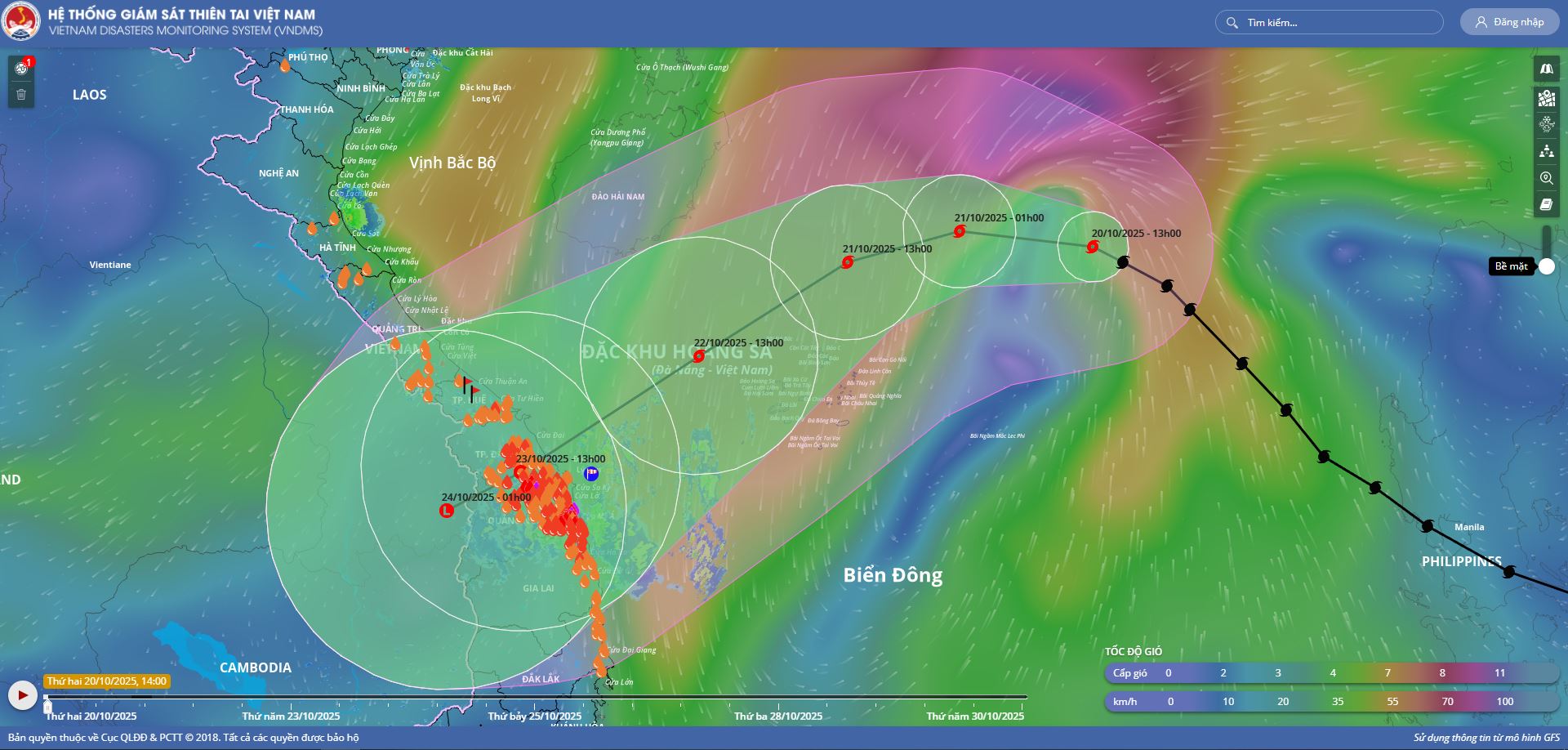 - Hồi 13 giờ ngày 19/10, vị trí tâm bão ở vào khoảng 14,7 độ Vĩ Bắc; 120,4 độ Kinh Đông, trên khu vực miền Trung Phi-líp-pin. Sức gió mạnh nhất vùng gần tâm bão mạnh cấp 9 (75-88km/giờ), giật cấp 11. Di chuyển theo hướng Tây Bắc với tốc độ 20-25km/h.