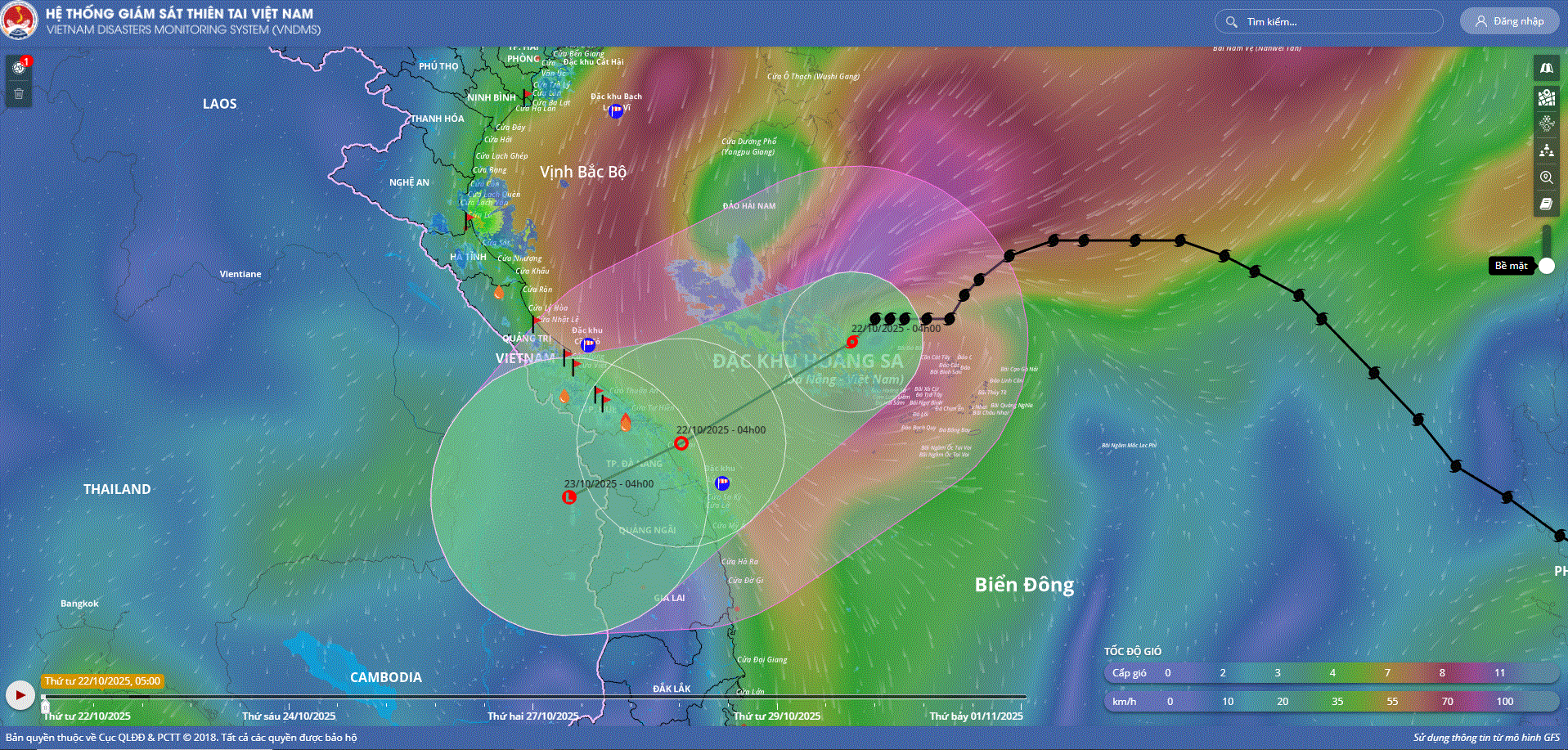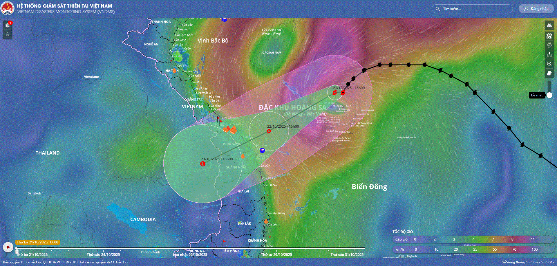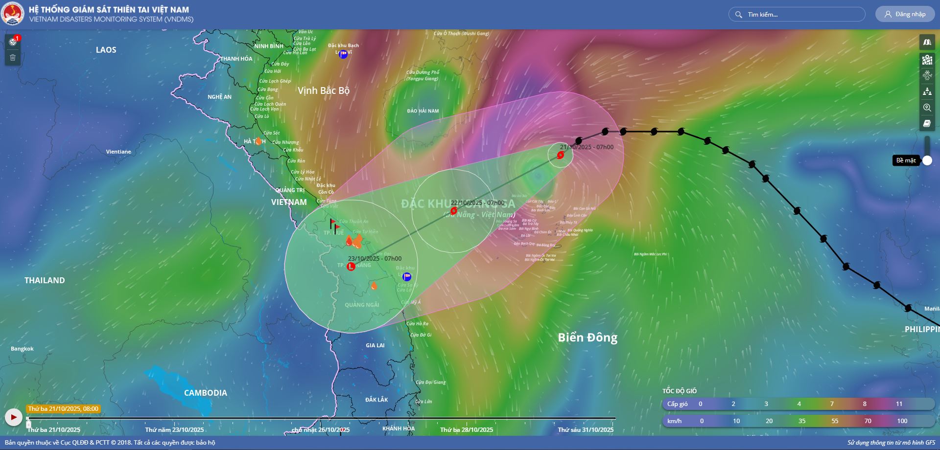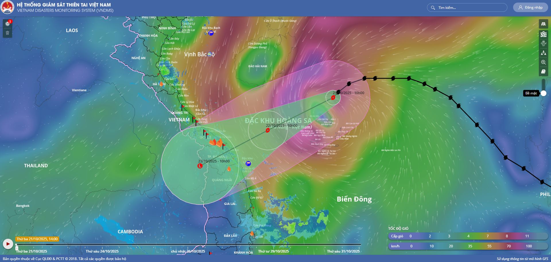 - Hồi 13 giờ ngày 21/10, vị trí tâm bão ở vào khoảng 17,5 độ Vĩ Bắc; 112,2 độ Kinh Đông, trên vùng biển phía Bắc đặc khu Hoàng Sa, cách Tp. Đà Nẵng khoảng 450km về phía Đông Đông Bắc. Sức gió mạnh nhất vùng gần tâm bão mạnh cấp 9-10 (75-102km/giờ), giật cấp 12. Di chuyển theo hướng Tây Nam, tốc độ 10-15km/h.