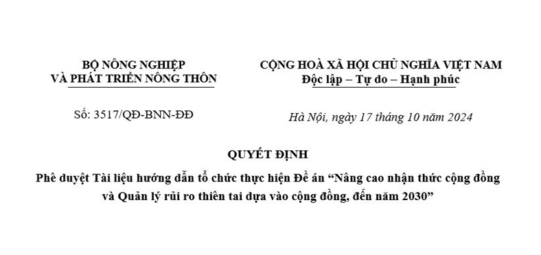On October 17, 2024, the Ministry of Agriculture and Rural Development approved the Guidance Document for the implementation of the Project "Raising public awareness and Community-based disaster risk management, by 2030" (Decision No. 3517/QD-BNN-DD)