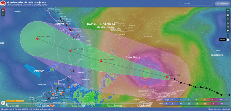 Hồi 16 giờ ngày 05/11, vị trí tâm bão ở vào khoảng 12,1 độ Vĩ Bắc; 117,0 độ Kinh Đông, cách đảo Song Tử Tây khoảng 300km về phía Đông Đông Bắc, cách Quy Nhơn (Gia Lai) khoảng 880km về phía Đông Đông Nam. Sức gió mạnh nhất vùng gần tâm bão mạnh cấp 14 (150-166 km/giờ), giật cấp 17. Di chuyển theo hướng Tây Tây Bắc, tốc độ khoảng 25km/h.