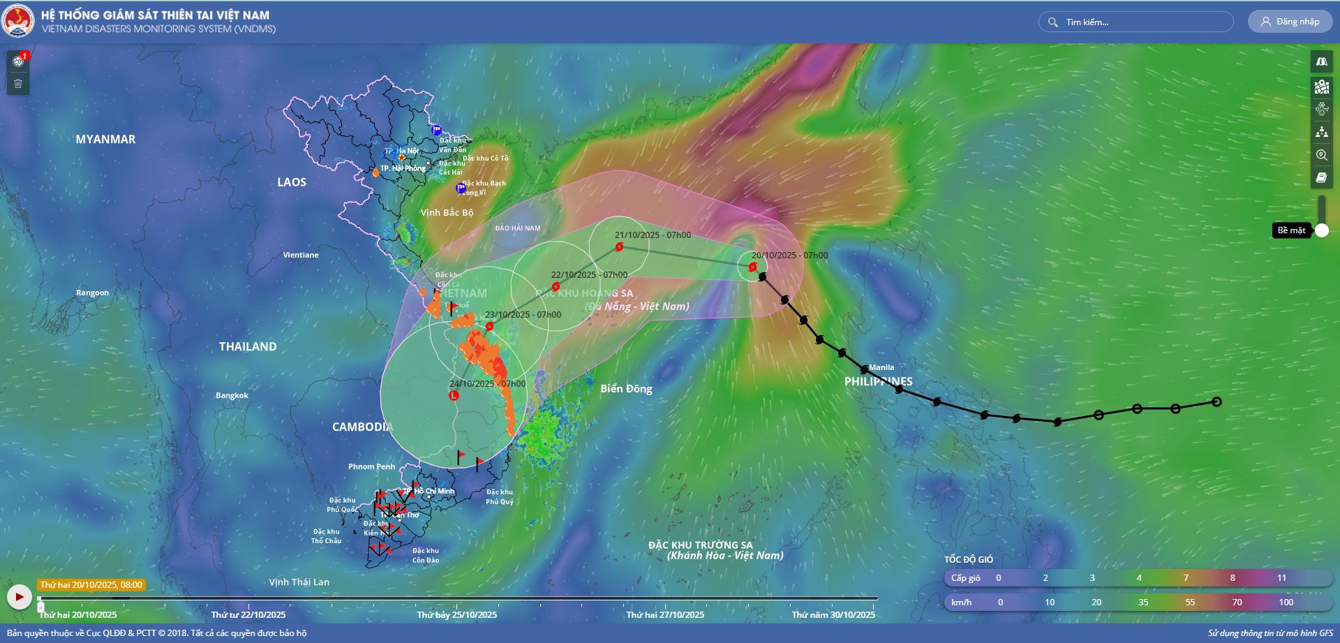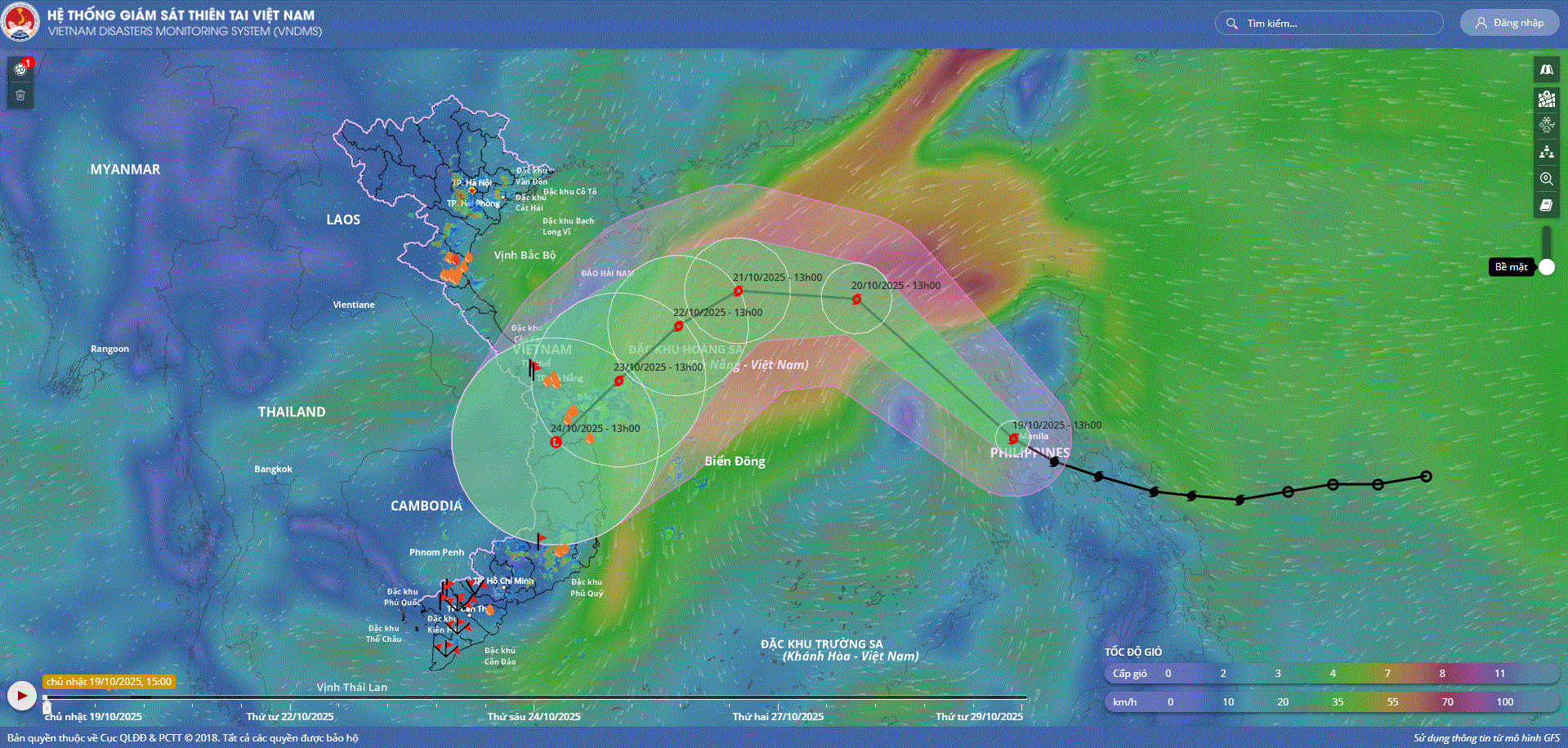 - Hồi 13 giờ ngày 19/10, vị trí tâm bão ở vào khoảng 14,7 độ Vĩ Bắc; 120,4 độ Kinh Đông, trên khu vực miền Trung Phi-líp-pin. Sức gió mạnh nhất vùng gần tâm bão mạnh cấp 9 (75-88km/giờ), giật cấp 11. Di chuyển theo hướng Tây Bắc với tốc độ 20-25km/h.