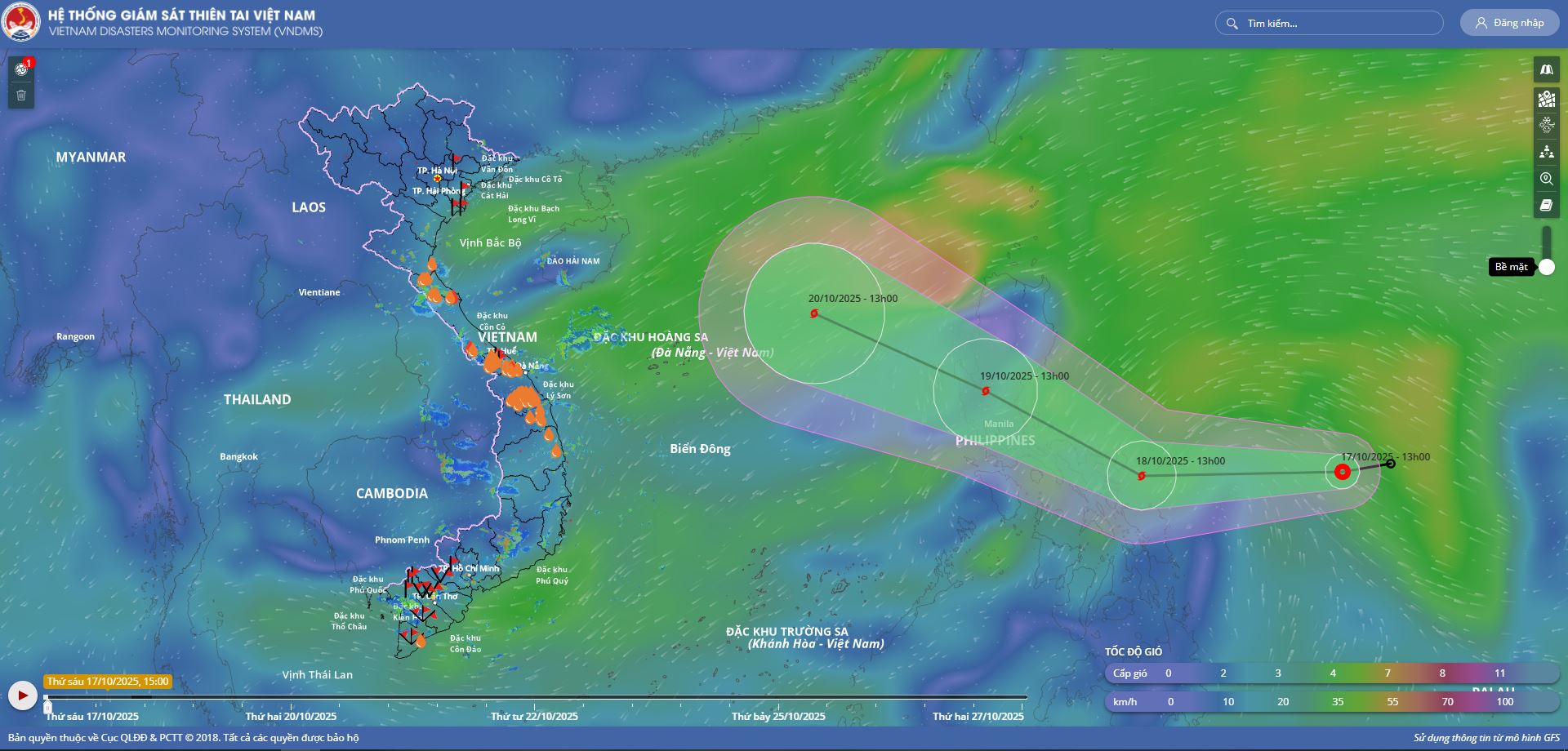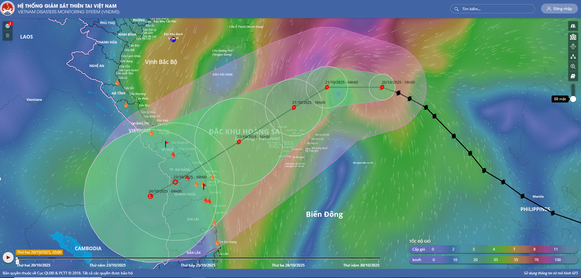 - Hồi 19 giờ ngày 18/10, vị trí tâm bão ở vào khoảng 13,3 độ Vĩ Bắc; 124,2 độ Kinh Đông, trên khu vực phía Đông miền Trung Phi-líp-pin. Sức gió mạnh nhất vùng gần tâm bão mạnh cấp 8 (62-74km/giờ), giật cấp 10. Di chuyển theo hướng Tây Tây Bắc với tốc độ khoảng 20km/h.